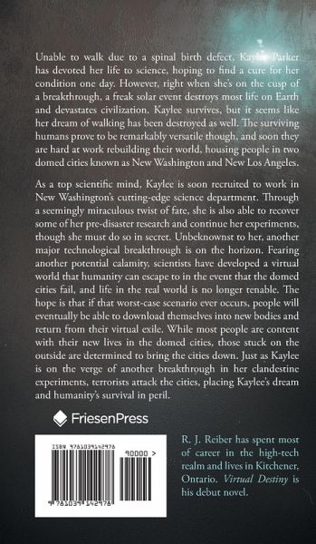 Unable to walk due to a spinal birth defect, Kaylee Parker has devoted her life to science, hoping to find a cure for her condition one day. However, right when she's on the cusp of a breakthrough, a freak solar event destroys most life on Earth and devastates civilization. Kaylee survives, but it seems like her dream of walking has been destroyed as well. The surviving humans prove to be remarkably versatile though, and soon they are hard at work rebuilding their world, housing people in two domed cities known as New Washington and New Los Angeles. As a top scientific mind, Kaylee is soon recruited to work in New Washington's cutting-edge science department. Through a seemingly miraculous twist of fate, she is also able to recover some of her pre-disaster research and continue her experiments, though she must do so in secret. Unbeknownst to her, another major technological breakthrough is on the horizon. Fearing another potential calamity, scientists have developed a virtual world that humanity can escape to in the event that the domed cities fail, and life in the real world is no longer tenable. The hope is that if that worst-case scenario ever occurs, people will eventually be able to download themselves into new bodies and return from their virtual exile. While most people are content with their new lives in the domed cities, those stuck on the outside are determined to bring the cities down. Just as Kaylee is on the verge of another breakthrough in her clandestine experiments, terrorists attack the cities, placing Kaylee's dream and humanity's survival in peril.
