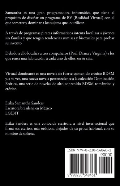 Samantha es una gran programadora informática que tiene el propósito de diseñar un programa de RV (Realidad Virtual) con el que someter y dominar a los sujetos que lo utilicen. A través de programas piratas informáticos intenta localizar a jóvenes sin familia y que tengan tendencias sumisas y bisexuales para probar su invento. Debido a ello localiza a tres compañeros (Paul, Diana y Virginia) a los que renta una habitación, a cada uno de ellos, en su casa. Virtual dominante es una novela de fuerte contenido erótico BDSM y, a su vez, una nueva novela perteneciente a la colección Dominación Erótica, una serie de novelas de alto contenido BDSM romántico y erótico.