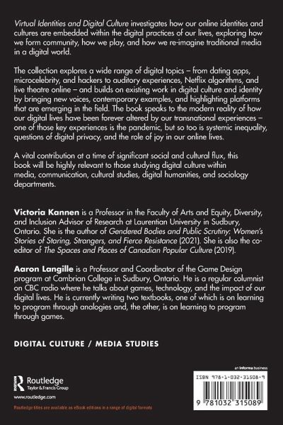 The collection explores a wide range of digital topics - from dating apps, microcelebrity, and hackers to auditory experiences, Netflix algorithms, and live theatre online - and builds on existing work in digital culture and identity by bringing new voices, contemporary examples, and highlighting platforms that are emerging in the field. The book speaks to the modern reality of how our digital lives have been forever altered by our transnational experiences - one of those key experiences is the pandemic, but so too is systemic inequality, questions of digital privacy, and the role of joy in our online lives.