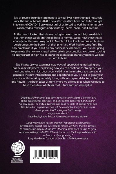 Why this report, why now?It is of course an understatement to say our lives have changed massively since the end of March 2020. The restrictions that have had to be brought in to control COVID-19 saw almost all of us forced to work from home, only connected to our colleagues and clients by Teams, Zoom, and Facetime.At the time it looked like this was going to be a six-month blip. We'd ride it out then things would start to go back to normal and we could carry on as we were. We all now know that is definitely not the case. As I started writing this book in late October 2020 we had started to see a slight return to the office - albeit in shifts to maintain the required social distancing - and face-to-face meetings over coffee or lunch were starting to creep back in. However, it now looks as though in the short-term at least the restrictions will get tighter before they relax again.But you know all this. What does it have to do with business development?Way back in March, a lot of law firms pushed business development to the bottom of their priorities. Work had to come first. And, as we can't do business development the way we always have, there was no way to keep it going even if we wanted to.The only problem is, if you don't do any business development, you are not going to generate the new work required to sustain your practice. You are also going to put yourself at high risk of losing the client relationships you have worked so hard to build. This meant we had to quickly come up with new ways to do business development from home. We had to adapt our approach by using the tools that were available to us. We had to replace physical business development with virtual business development. The Virtual Lawyer examines those new virtual ways of approaching marketing and business development, explaining how you can continue to strengthen your existing relationships, boost your visibility in the markets you serve, and generate the new introductions and new opportunities you'll need to grow your practice whilst working remotely.The book uses a three-step model, designed to take us from where we are today to where we need to be in the future, whatever that future ends up looking like. These three steps are React, Refresh, and Return.