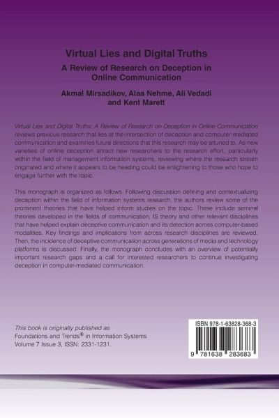 Virtual Lies and Digital Truths: A Review of Research on Deception in Online Communication reviews previous research that lies at the intersection of deception and computer-mediated communication and examines future directions that this research may be attuned to. As new varieties of online deception attract new researchers to the research effort, particularly within the field of management information systems, reviewing where the research stream originated and where it appears to be heading could be enlightening to those who hope to engage further with the topic. This monograph is organized as follows. Following discussion defining and contextualizing deception within the field of information systems research, the authors review some of the prominent theories that have helped inform studies on the topic. These include seminal theories developed in the fields of communication, IS theory and other relevant disciplines that have helped explain deceptive communication and its detection across computer-based modalities. Key findings and implications from across research disciplines are reviewed. Then, the incidence of deceptive communication across generations of media and technology platforms is discussed. Finally, the monograph concludes with an overview of potentially important research gaps and a call for interested researchers to continue investigating deception in computer-mediated communication.