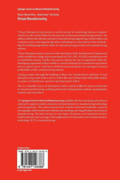 Virtual Manufacturing is centered on the description of the development of augmented reality models for a range of processes based on CNC, PLC, SCADA, mechatronics and on embedded systems. Further discussions address the use of augmented reality for developing augmented reality models to control contemporary manufacturing systems and to acquire micro- and macro-level decision parameters for managers to boost profitability of their manufacturing systems.