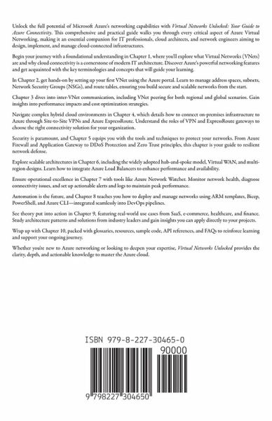 Unlock the full potential of Microsoft Azure's networking capabilities with Virtual Networks Unlocked: Your Guide to Azure Connectivity. This comprehensive and practical guide walks you through every critical aspect of Azure Virtual Networking, making it an essential companion for IT professionals, cloud architects, and network engineers aiming to design, implement, and manage cloud-connected infrastructures. Begin your journey with a foundational understanding in Chapter 1, where you'll explore what Virtual Networks (VNets) are and why cloud connectivity is a cornerstone of modern IT architecture. Discover Azure's powerful networking features and get acquainted with the key terminologies and concepts that will guide your learning. In Chapter 2, get hands-on by setting up your first VNet using the Azure portal. Learn to manage address spaces, subnets, Network Security Groups (NSGs), and route tables, ensuring you build secure and scalable networks from the start. Chapter 3 dives into inter-VNet communication, including VNet peering for both regional and global scenarios. Gain insights into performance impacts and cost optimization strategies. Navigate complex hybrid cloud environments in Chapter 4, which details how to connect on-premises infrastructure to Azure through Site-to-Site VPNs and Azure ExpressRoute. Understand the roles of VPN and ExpressRoute gateways to choose the right connectivity solution for your organization. Security is paramount, and Chapter 5 equips you with the tools and techniques to protect your networks. From Azure Firewall and Application Gateway to DDoS Protection and Zero Trust principles, this chapter is your guide to resilient network defense. Explore scalable architectures in Chapter 6, including the widely adopted hub-and-spoke model, Virtual WAN, and multi-region designs. Learn how to integrate Azure Load Balancers to enhance performance and availability. Ensure operational excellence in Chapter 7 with tools like Azure Network Watcher. Monitor network health, diagnose connectivity issues, and set up actionable alerts and logs to maintain peak performance. Automation is the future, and Chapter 8 teaches you how to deploy and manage networks using ARM templates, Bicep, PowerShell, and Azure CLI-integrated seamlessly into DevOps pipelines. See theory put into action in Chapter 9, featuring real-world use cases from SaaS, e-commerce, healthcare, and finance. Study architecture patterns and solutions from industry leaders and gain insights you can apply directly to your projects. Wrap up with Chapter 10, packed with glossaries, resources, sample code, API references, and FAQs to reinforce learning and support your ongoing journey. Whether you're new to Azure networking or looking to deepen your expertise, Virtual Networks Unlocked provides the clarity, depth, and actionable knowledge to master the Azure cloud.