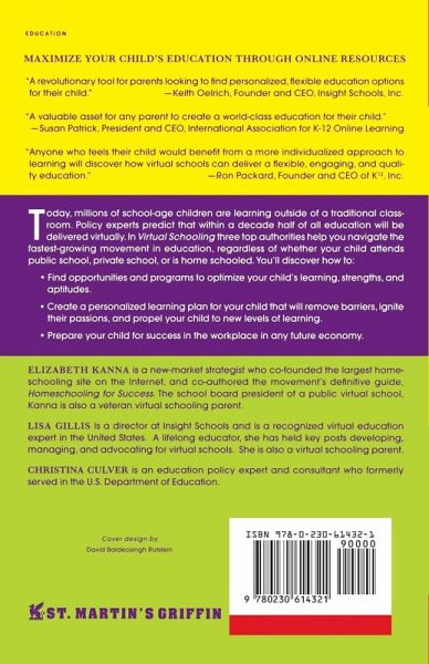 Today, millions of school-age children are learning outside of a traditional classroom and using cutting edge educational options. Policy experts predict that in a decade half of all education will be delivered virtually. In Virtual Schooling three top authorities help you navigate the fastest growing movement in education -- regardless of whether your child attends public school, private school or is home schooled. You'll discover how to: · Find opportunities and programs to optimize your child's learning, strengths and aptitudes. · Create a personalized learning plan for your child, which can remove barriers, ignite their passions and propel your child to new levels of learning. · Prepare your child for success in the workplace in any future economy.