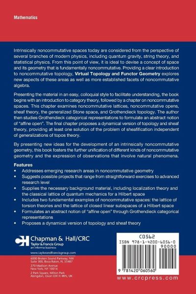 Intrinsically noncommutative spaces today are considered from the perspective of several branches of modern physics, including quantum gravity, string theory, and statistical physics. From this point of view, it is ideal to devise a concept of space and its geometry that is fundamentally noncommutative. Providing a clear introduction to noncommutative topology, Virtual Topology and Functor Geometry explores new aspects of these areas as well as more established facets of noncommutative algebra. Presenting the material in an easy, colloquial style to facilitate understanding, the book begins with an introduction to category theory, followed by a chapter on noncommutative spaces. This chapter examines noncommutative lattices, noncommutative opens, sheaf theory, the generalized Stone space, and Grothendieck topology. The author then studies Grothendieck categorical representations to formulate an abstract notion of "affine open". The final chapter proposes a dynamical version of topology and sheaf theory, providing at least one solution of the problem of sheafification independent of generalizations of topos theory. By presenting new ideas for the development of an intrinsically noncommutative geometry, this book fosters the further unification of different kinds of noncommutative geometry and the expression of observations that involve natural phenomena.