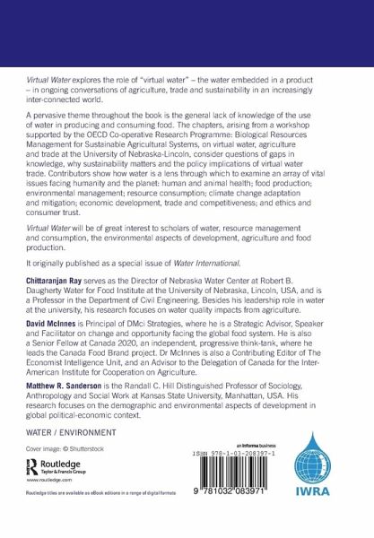 A pervasive theme throughout the book is the general lack of knowledge of the use of water in producing and consuming food. The chapters, arising from a workshop supported by the OECD Co-operative Research Programme: Biological Resources Management for Sustainable Agricultural Systems, on virtual water, agriculture and trade at the University of Nebraska-Lincoln, consider questions of gaps in knowledge, why sustainability matters and the policy implications of virtual water trade. Contributors show how water is a lens through which to examine an array of vital issues facing humanity and the planet: human and animal health; food production; environmental management; resource consumption; climate change adaptation and mitigation; economic development, trade and competitiveness; and ethics and consumer trust.