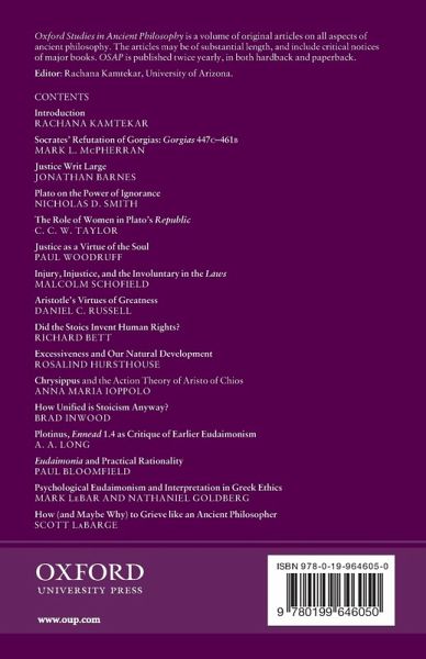 * 1: Rachana Kamtekar: Introduction * 2: Mark McPherran: Socrates' Refutation of Gorgias: Gorgias 447c-461b * 3: Jonathan Barnes: Justice Writ Large * 4: Nicholas D. Smith: Plato on the Power of Ignorance * 5: C. C. W. Taylor: The Role of Women in Plato's Republic * 6: Paul Woodruff: Justice as a Virtue of the Soul * 7: Malcolm Schofield: Injury, Injustice, and the Involuntary in the Laws * 8: Daniel C. Russell: Aristotle's Large-Scale Virtues * 9: Richard Bett: Did the Stoics Invent Human Rights? * 10: Rosalind Hursthouse: Excessiveness and Our Natural Development * 11: Anna Maria Ioppolo: Chrysippus and the Action Theory of Aristo of Chios * 12: Brad Inwood: How Unified is Stoicism Anyway? * 13: A. A. Long: Plotinus, Ennead 1.4 as Critique of Earlier Eudaimonism * 14: Paul Bloomfield: Eudaimonia and Practical Rationality * 15: Mark LeBar and Nathaniel Goldberg: Psychological Eudaimonism and Interpretation in Greek Ethics * 16: Scott LaBarge: How (and Maybe Why) to Grieve like an Ancient Philosopher