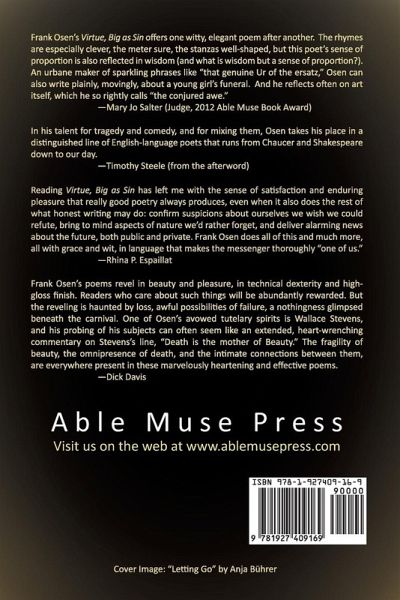 Virtue, Big as Sin is impressively wide-ranging in theme and style. It illuminates everyday vignettes with solicitous spotlights such as the bereaved son sorting the contents of his father’s medicine cabinet, or the father whose son’s driver’s education recalls the time his own “unharnessed” Mustang went “bungeeing” around a bend; it celebrates the artist’s creative highs, or reflects on the misfortunate who is forever nearing the threshold of achievement, aware that life may prove a “most inept librettist” and should thus be paired with our “strongest song.” Osen’s dexterity with both formal and free verse is apparent. His wit and humor prevent the serious from becoming ponderous while his intelligent insight lends depth to the lighthearted. Reading and rereading this outstanding debut collection, it is easy to see why—from the first poem to the last—it is a worthy winner of the 2012 Able Muse Book Award. PRAISE FOR VIRTUE, BIG AS SIN: Frank Osen’s Virtue, Big as Sin offers one witty, elegant poem after another. The rhymes are especially clever, the meter sure, the stanzas well-shaped, but this poet’s sense of proportion is also reflected in wisdom (and what is wisdom but a sense of proportion?). An urbane maker of sparkling phrases like “that genuine Ur of the ersatz,” Osen can also write plainly, movingly, about a young girl’s funeral. And he reflects often on art itself, which he so rightly calls “the conjured awe.” —Mary Jo Salter (Judge, 2012 Able Muse Book Award) In his talent for tragedy and comedy, and for mixing them, Osen takes his place in a distinguished line of English-language poets that runs from Chaucer and Shakespeare down to our day. —Timothy Steele (from the afterword) Reading Virtue, Big as Sin has left me with the sense of satisfaction and enduring pleasure that really good poetry always produces, even when it also does the rest of what honest writing may do: confirm suspicions about ourselves we wish we could refute, bring to mind aspects of nature we’d rather forget, and deliver alarming news about the future, both public and private. Frank Osen does all of this and much more, all with grace and wit, in language that makes the messenger thoroughly “one of us.” —Rhina P. Espaillat Frank Osen’s poems revel in beauty and pleasure, in technical dexterity and high-gloss finish. Readers who care about such things will be abundantly rewarded. But the reveling is haunted by loss, awful possibilities of failure, a nothingness glimpsed beneath the carnival. One of Osen’s avowed tutelary spirits is Wallace Stevens, and his probing of his subjects can often seem like an extended, heart-wrenching commentary on Stevens’s line, “Death is the mother of Beauty.” The fragility of beauty, the omnipresence of death, and the intimate connections between them, are everywhere present in these marvelously heartening and effective poems. —Dick Davis ABOUT THE AUTHOR: Frank Osen was born in Yokosuka, Japan, in 1954, grew up in Southern California, and is a graduate of the University of California at Berkeley and Loyola Law School in Los Angeles. He worked for many years in law, as general counsel to health care companies and also in real estate investment. He lives in Pasadena, California, and walks to work at the Huntington Library. He and his wife, Susan, have been married for thirty years and have three grown children. Virtue, Big as Sin is his first full-length collectio