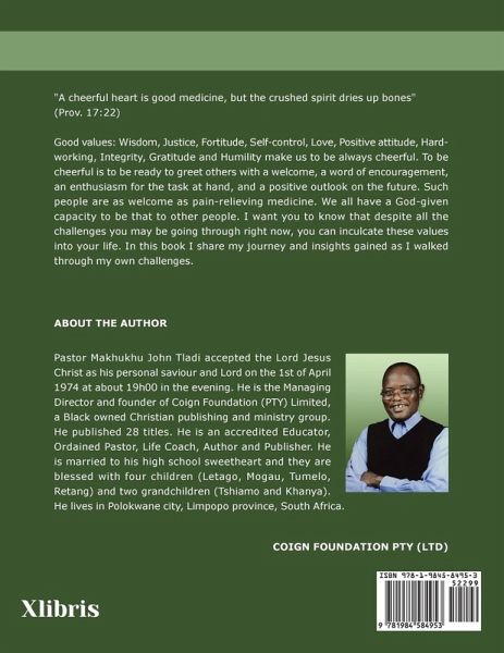 "A cheerful heart is good medicine, but the crushed spirit dries up bones" (Prov. 17:22) Good values: Wisdom, Justice, Fortitude, Self-control, Love, Positive attitude, Hard-working, Integrity, Gratitude and Humility make us to be cheerful always. To be cheerful is to be ready to greet others with a welcome, a word of encouragement, an enthusiasm for the task at hand, and a positive outlook on the future. Such people are as welcome as pain relieving medicine. We all have a God-given capacity pain relieving medicines to our people. I want you to know that despite all the challenged you may be going through right now, you can inculcate these values into your life. In this book I share my journey and insights I gained as I walked through my own challenges.