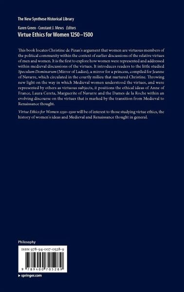 List of Illustrations.- Acknowledgements.- Notes on contributors.- Abbreviations. Introduction.- 1. Does Virtue Recognise Gender? Christine de Pizan's City of Ladies in the Light of Scholastic Debate; István P. Bejczy.- 2. The Speculum dominarum (Miroir des dames) and Transformations of the Literature of Instruction for Women in the Early Fourteenth Century; Constant J. Mews.- 3. A Mirror of Queenship: The Speculum dominarum and the Demands of Justice; Rina Lahav.- 4. A Lady's Guide to Salvation: the Miroir des dames Compilation; Janice Pinder.- 5. Charles V's Visual Definition of the Queen's Virtues; Cécile Quentel-Touche.- 6. Jean Gerson's Writings to his Sisters and Christine de Pizan's Livre des trois vertus: an Intellectual Dialogue Culminating in Friendship; Earl Jeffrey Richards.- 7. From Le Miroir des dames to Le Livre des trois vertus; Karen Green.- 8. Appearing Virtuous: Christine de Pizan's Le Livre des trois vertus and Anne de France's Les Enseignements d'Anne de France; Tracy Adams.- 9. Weaving Virtue: Laura Cereta as a New Penelope; Natasha Amendola.- 10. Margherita Cantelmo and the Worth of Women in Renaissance Italy; Carolyn James.- 11. Like Mother Like Daughter: Moral and Literary Virtues in French Renaissance Women's Writings; Catherine Müller.- 12. Joanna of Castile's Entry into Brussels: Viragos, Wise and Virtuous Women; Anne-Marie Legaré.- Bibliography.- Index of manuscripts cited.- General index.