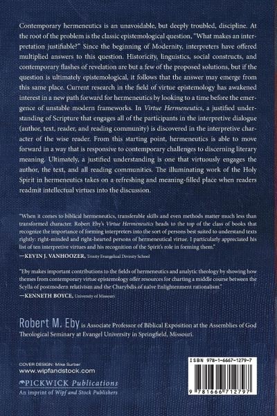 Contemporary hermeneutics is an unavoidable, but deeply troubled, discipline. At the root of the problem is the classic epistemological question, ""What makes an interpretation justifiable?"" Since the beginning of Modernity, interpreters have offered multiplied answers to this question. Historicity, linguistics, social constructs, and contemporary flashes of revelation are but a few of the proposed solutions, but if the question is ultimately epistemological, it follows that the answer may emerge from this same place. Current research in the field of virtue epistemology has awakened interest in a new path forward for hermeneutics by looking to a time before the emergence of unstable modern frameworks. In Virtue Hermeneutics, a justified understanding of Scripture that engages all of the participants in the interpretive dialogue (author, text, reader, and reading community) is discovered in the interpretive character of the wise reader. From this starting point, hermeneutics is able to move forward in a way that is responsive to contemporary challenges to discerning literary meaning. Ultimately, a justified understanding is one that virtuously engages the author, the text, and all reading communities. The illuminating work of the Holy Spirit in hermeneutics takes on a refreshing and meaning-filled place when readers readmit intellectual virtues into the discussion.