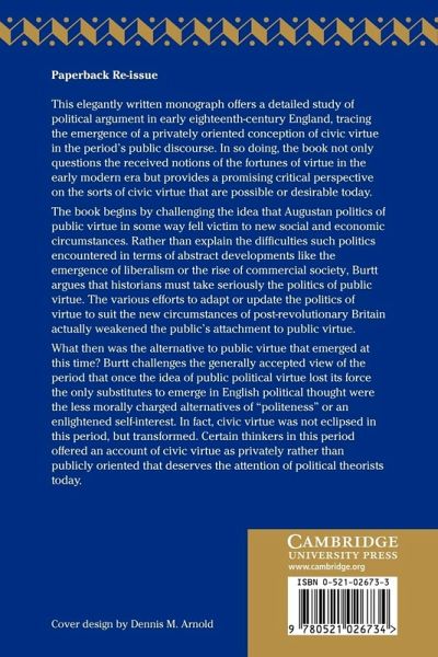 This book offers a detailed study of political argument in early eighteenth-century England, a time in which the politics of virtue were vigorously pursued - and just as vigorously challenged. In tracing the emergence of a privately orientated conception of civic virtue from the period's public discourse, this book not only challenges the received notions of the fortunes of virtue in the early modern era but provides a promising critical perspective on the question of what sort of politics of virtue is possible or desirable today.