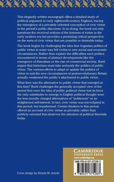 This book offers a detailed study of political argument in early eighteenth-century England, a time in which the politics of virtue were vigorously pursued - and just as vigorously challenged. In tracing the emergence of a privately orientated conception of civic virtue from the period's public discourse, this book not only challenges the received notions of the fortunes of virtue in the early modern era but provides a promising critical perspective on the question of what sort of politics of virtue is possible or desirable today.
