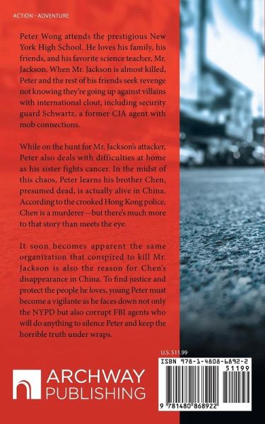 Peter Wong attends the prestigious New York High School. He loves his family, his friends, and his favorite science teacher, Mr. Jackson. When Mr. Jackson is almost killed, Peter and the rest of his friends seek revenge not knowing they're going up against villains with international clout, including security guard Schwartz, a former CIA agent with mob connections. While on the hunt for Mr. Jackson's attacker, Peter also deals with difficulties at home as his sister fights cancer. In the midst of this chaos, Peter learns his brother Chen, presumed dead, is actually alive in China. According to the crooked Hong Kong police, Chen is a murderer-but there's much more to that story than meets the eye. It soon becomes apparent the same organization that conspired to kill Mr. Jackson is also the reason for Chen's disappearance in China. To find justice and protect the people he loves, young Peter must become a vigilante as he faces down not only the NYPD but also corrupt FBI agents who will do anything to silence Peter and keep the horrible truth under wraps.