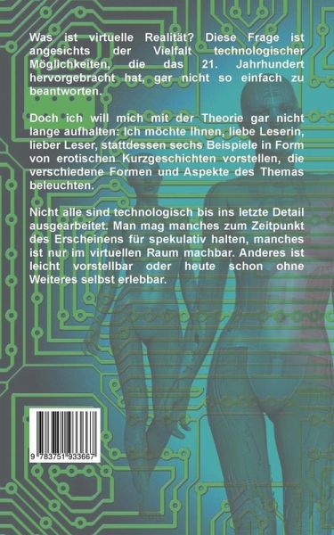 Was ist virtuelle Realität? Diese Frage ist angesichts der Vielfalt technologischer Möglichkeiten, die das 21. Jahrhundert hervorgebracht hat, gar nicht so einfach zu beantworten. Doch ich will mich mit der Theorie gar nicht lange aufhalten: Ich möchte Ihnen, liebe Leserin, lieber Leser, stattdessen sechs Beispiele in Form von erotischen Kurzgeschichten vorstellen, die verschiedene Formen und Aspekte des Themas beleuchten.Nicht alle sind technologisch bis ins letzte Detail ausgearbeitet. Man mag manches zum Zeitpunkt des Erscheinens für spekulativ halten, manches ist nur im virtuellen Raum machbar. Anderes ist leicht vorstellbar oder heute schon ohne Weiteres selbst erlebbar.This book is also available in English as "Virtual Encounters".