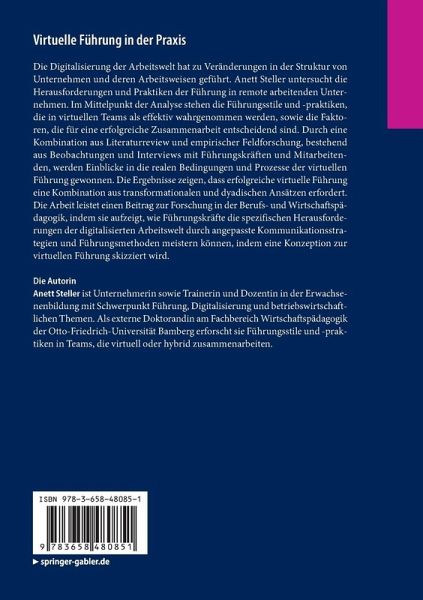 Die Digitalisierung der Arbeitswelt hat zu Veränderungen in der Struktur von Unternehmen und deren Arbeitsweisen geführt. Anett Steller untersucht die Herausforderungen und Praktiken der Führung in remote arbeitenden Unternehmen. Im Mittelpunkt der Analyse stehen die Führungsstile und -praktiken, die in virtuellen Teams als effektiv wahrgenommen werden, sowie die Faktoren, die für eine erfolgreiche Zusammenarbeit entscheidend sind. Durch eine Kombination aus Literaturreview und empirischer Feldforschung, bestehend aus Beobachtungen und Interviews mit Führungskräften und Mitarbeitenden, werden Einblicke in die realen Bedingungen und Prozesse der virtuellen Führung gewonnen. Die Ergebnisse zeigen, dass erfolgreiche virtuelle Führung eine Kombination aus transformationalen und dyadischen Ansätzen erfordert. Die Arbeit leistet einen Beitrag zur Forschung in der Berufs- und Wirtschaftspädagogik, indem sie aufzeigt, wie Führungskräfte die spezifischen Herausforderungen der digitalisierten Arbeitswelt durch angepasste Kommunikationsstrategien und Führungsmethoden meistern können, indem eine Konzeption zur virtuellen Führung skizziert wird.