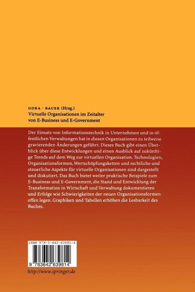 Der Einsatz von Informationstechnik in Unternehmen und in öffentlichen Verwaltungen hat in diesen Organisationen zu teilweise gravierenden Änderungen geführt. Dieses Buch gibt einen Überblick über diese Entwicklungen und einen Ausblick auf zukünftige Trends auf dem Weg zur virtuellen Organisation. Technologien, Organisationsformen, Wertschöpfungsketten und rechtliche und steuerliche Aspekte für virtuelle Organisationen sind dargestellt und diskutiert. Das Buch bietet weiter praktische Beispiele zum E-Business und E-Government, die Stand und Entwicklung der Transformation in Wirtschaft und Verwaltung dokumentieren und Erfolge wie Schwierigkeiten der neuen Organisationsform offen legen. Graphiken und Tabellen erhöhen die Lesbarkeit des Buches.