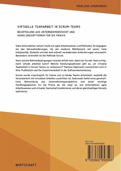Viele Unternehmen setzen heute auf agile Arbeitsweisen und Methoden. So begegnen sie den Herausforderungen, die der moderne Wettbewerb mit seiner hohe Komplexität, Dynamik und den sich schnell verändernden Anforderungen verursacht. Besonders verbreitet ist die Methode Scrum.Doch welche Rahmenbedingungen müssen erfüllt sein, damit ein Scrum-Team erfolgreich virtuell arbeiten kann? Welche Handlungsoptionen gibt es, um virtuelle Teamarbeit in Scrum-Teams zu verbessern? Marlena Sadrowski konzentriert sich in ihrer Publikation auf die Zusammenarbeit in der Softwareentwicklung.Scrum wurde ursprünglich für kleine und co-lokale Teams entwickelt, weshalb die Vereinbarkeit mit virtuellem Arbeiten umstritten ist. Sadrowski liefert eine ganzheitliche Betrachtung aus Unternehmensperspektive und leitet wichtige Handlungsoptionen für die Praxis ab. Sie zeigt so, wie Unternehmen agile Arbeitsweisen und virtuelle Teamarbeit kombinieren und deren gleichzeitigen Einsatz optimieren.Aus dem Inhalt:- Digital Work;- New Work;- Digitalisierung;- Personalmanagement;- Homeoffice