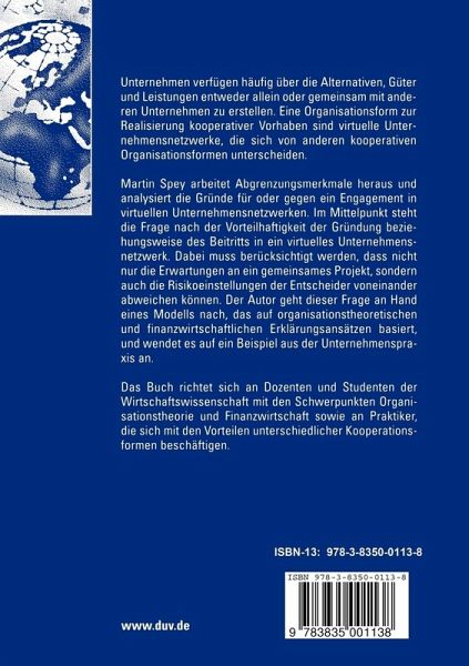 Martin Spey arbeitet Abgrenzungsmerkmale heraus und analysiert die Gründe für oder gegen ein Engagement in virtuellen Unternehmensnetzwerken. Im Mittelpunkt steht die Frage nach der Vorteilhaftigkeit der Gründung beziehungsweise des Beitritts in ein virtuelles Unternehmensnetzwerk. Dabei muss berücksichtigt werden, dass nicht nur die Erwartungen an ein gemeinsames Projekt, sondern auch die Risikoeinstellungen der Entscheider voneinander abweichen können. Der Autor geht dieser Frage an Hand eines Modells nach, das auf organisationstheoretischen und finanzwirtschaftlichen Erklärungsansätzen basiert, und wendet es auf ein Beispiel aus der Unternehmenspraxis an.