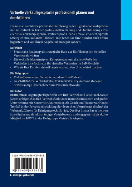 Dieses essential ist eine praxisnahe Einführung in den digitalen Verkaufsprozess und unterstützt Sie bei der professionellen Planung und Durchführung virtueller B2B-Verkaufsgespräche. Vertriebsprofi Henrik Trenkel erläutert erprobte Strategien und konkrete Taktiken, mit denen Sie Ihre Kunden auch online begeistern und von Ihrem Angebot überzeugen können.
