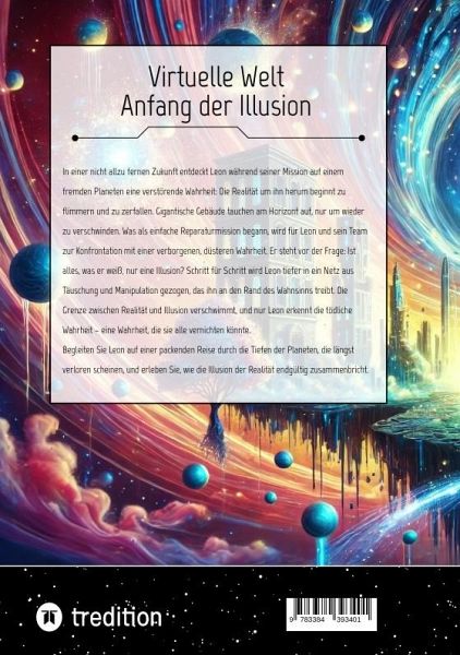 Das Buch "Virtuelle Welt - Anfang der Illusion" geht um eine tiefgreifende und fesselnde Erkundung von Realität und Täuschung. Die Hauptfigur Leon wird von seltsamen Visionen heimgesucht, die ihn nicht nur auf seiner Mission auf einem fremden Planeten verfolgen, sondern auch in seine heimatliche Welt zurückkehren. Diese Visionen, die zwischen einer scheinbar idyllischen Realität und einer düsteren, zerstörten Welt wechseln, lassen ihn an seiner eigenen Wahrnehmung zweifeln. Ist es nur der Stress der Mission, oder offenbart sich ihm eine viel größere Wahrheit, die über die bekannte Realität hinausgeht?Die Geschichte entfaltet sich in einer futuristischen Umgebung, in der Technologie und Überwachung eine zentrale Rolle spielen. Unsichtbare Mächte scheinen über Leon zu wachen und seine Schritte zu beobachten, während er sich immer tiefer in die Frage verstrickt, was real ist und was nicht. Die Grenzen zwischen den Welten beginnen zu verschwimmen, als er sowohl in seinem Heim als auch auf dem fremden Planeten mit erschütternden Visionen und rätselhaften Erscheinungen konfrontiert wird. Gigantische, geisterhafte Gebäude tauchen am Horizont auf, nur um wieder zu verschwinden, und Leon fühlt sich zunehmend wie eine Marionette in einem Spiel, das er nicht versteht.Ein weiterer zentraler Aspekt des Buches ist der mysteriöse Chip, den Leon entdeckt und der eine Schlüsselrolle in den Ereignissen zu spielen scheint. Dieser Chip, der sich seltsam vertraut anfühlt, könnte der Schlüssel zu den Geheimnissen der fremden Welt sein - oder der Beginn seines Untergangs. Mit jedem Kapitel gerät Leon tiefer in einen Sog aus Illusionen, Dunkelheit und unsichtbaren Mächten, die ihn nicht nur körperlich, sondern auch psychisch herausfordern. Seine Familie spürt die Veränderungen, doch niemand scheint ihm zu glauben oder die Wahrheit hinter seinen Worten zu erkennen.Die Spannung des Buches wird durch Leons innere Kämpfe getragen. Er versucht verzweifelt, sich an der scheinbaren Normalität seiner Familie und seines alltäglichen Lebens festzuhalten, doch die Realität um ihn herum beginnt, in sich zusammenzufallen. Sein Leben wird von Visionen beherrscht, die so real wirken, dass er nicht mehr zwischen Einbildung und Wirklichkeit unterscheiden kann. Am Ende bleibt die Frage: Ist Leon der einzige, der die wahre Natur der Welt erkennt, oder ist er dabei, den Verstand zu verlieren?"Virtuelle Welt - Anfang der Illusion" ist eine fesselnde Mischung aus Science-Fiction und Psychothriller, die den Leser bis zur letzten Seite in Atem hält. Die komplexen Verflechtungen von Realität, Technologie und psychologischen Spannungen machen das Buch zu einem intensiven Leseerlebnis, das die Grenzen der Vorstellungskraft herausfordert.Die Fortsetzung verspricht noch tiefere Einblicke in die verborgenen Geheimnisse der Welt, die Leon entdeckt hat, und lässt den Leser gespannt auf das warten, was als nächstes kommt.
