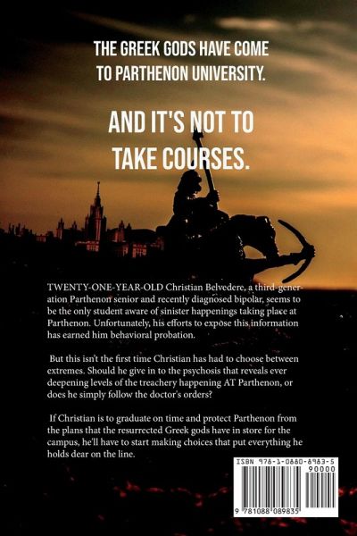 On the historic campus of the fictional Parthenon University lies Potential Street, a non-descript alley lined by the University's twelve clubs. Each club bears a sign of the Zodiac. The most notorious of the clubs is Pithon which has housed the ancient Greek deities in order to seize absolute political power in North America. All it needs to complete its devious plan is to have one qualifying student from each of the twelve Zodiac Signs participate on their birthdays in Virtues Constellation, a mega-spell that will consolidate all the power of the other clubs under Pithon. Twenty-one-year-old Christian Belvedere, a third-generation Parthenon senior and recently diagnosed bipolar, seems to be the only student aware of sinister happenings taking place in Pithon. Unfortunately, Christian's efforts to bring this information to the attention of the school's board has earned him behavioral probation, specifically for his allegations against seventy-two students of Pithon who he learns aren't students at all, but deposed Greek gods. He regards this punishment a death sentence for the school and the rest of humanity when he is forced to submit to medical treatment in order to be readmitted and graduate on time. But this isn't the first time Christian has had to choose between two extremes. Should he give in to the psychosis that reveals to him ever deepening levels of the treachery happening on Parthenon, or does he simply follow the doctor's orders? If he is to graduate on time and protect Parthenon from the ruin that the resurrected Greek gods have in store for the campus, he will have to start making choices that weigh true heroism against ambition and personal loss against the ultimate sacrifice.