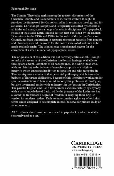 The Summa Theologiae ranks among the greatest documents of the Christian Church, and is a landmark of medieval western thought. It provides the framework for Catholic studies in systematic theology and for a classical Christian philosophy, and is regularly consulted by scholars of all faiths and none, across a range of academic disciplines. This paperback reissue of the classic Latin/English edition first published by the English Dominicans in the 1960s and 1970s, in the wake of the Second Vatican Council, has been undertaken in response to regular requests from readers and librarians around the world for the entire series of 61 volumes to be made available again. The original text is unchanged, except for the correction of a small number of typographical errors.