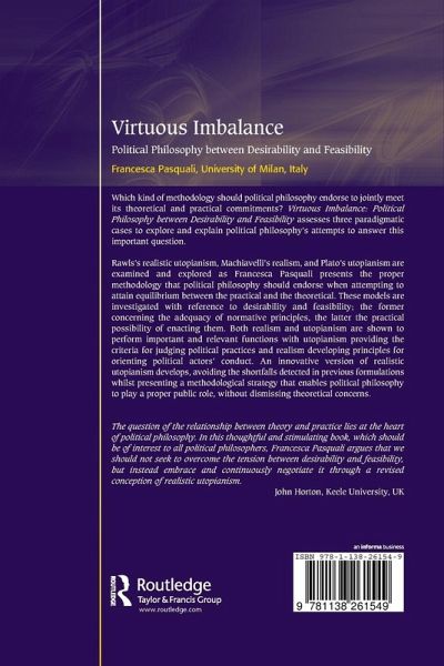 Which kind of methodology should political philosophy endorse to jointly meet its theoretical and practical commitments? Virtuous Imbalance: Political Philosophy between Desirability and Feasibility assesses three paradigmatic cases to explore and explain political philosophy's attempts to answer this important question. Rawls's realistic utopianism, Machiavelli's realism, and Plato's utopianism are examined and explored as Francesca Pasquali presents the proper methodology political philosophy should endorse when attempting to attain equilibrium between the practical and the theoretical.