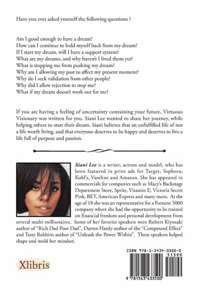 Have you ever asked yourself the following questions? Am I good enough to have a dream? How can I continue to hold myself back from my dream? If I start my dream, will I have a support system? What are my dreams, and why haven't I lived them yet? What is stopping me from pushing toward my dream? Why am I allowing my past to affect my present moment? Why do I seek validation from other people? Why did I allow rejection to stop me? What if my dream doesn't work out for me? If you are having a feeling of uncertainty concerning your future, Virtuous Visionary was written for you. Siani Lee wanted to share her journey while helping others to start their dream. Siani believes that an unfulfilled life is a life not worth living and that everyone deserves to be happy and deserves to live a life full of purpose and passion.