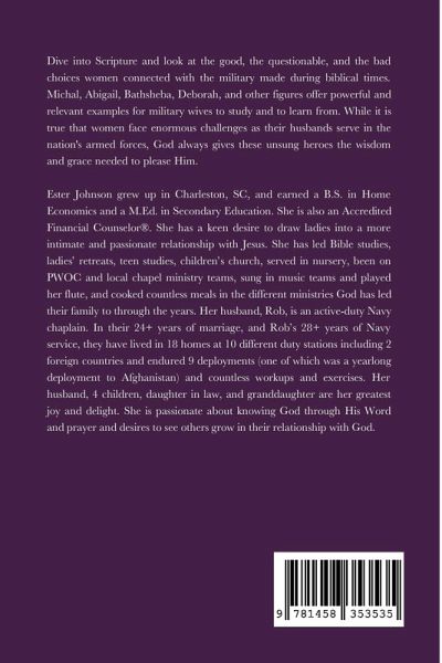 Dive into Scripture and look at the good, the questionable, and the bad choices women connected with the military made during biblical times. Michal, Abigail, Bathsheba, Deborah, and other figures offer powerful and relevant examples for military wives to study and to learn from. While it is true that women face enormous challenges as their husbands serve in the nation's armed forces, God always gives these unsung heroes the wisdom and grace needed to please Him.
