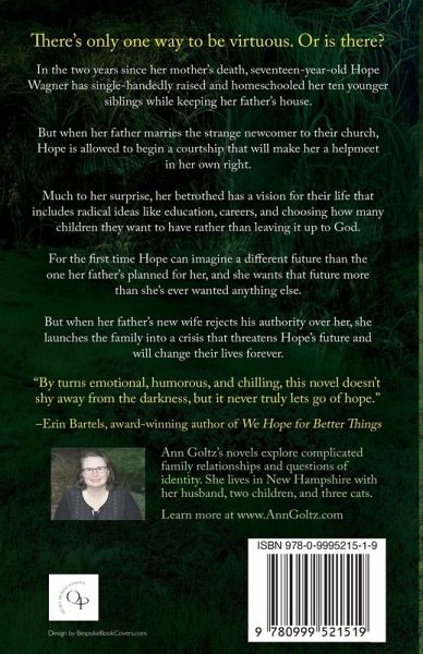 The sheltered eldest daughter of a Quiverfull family.Her naive new stepmother.The patriarch who controls them both. Isolated from the world except for their insular church community, Hope Wagner has little exposure to anything outside of her father's beliefs. That changes when he marries the worldly newcomer to their church. Jennifer Levine always wanted a large, close-knit family that lives according to the traditional values portrayed in her beloved historical novels. But after her marriage to Michael, a handsome widower at her new church, Jennifer's life becomes a nightmare of inadequacy and futility as she tries to embody her husband's idea of a virtuous woman. Michael Wagner will stop at nothing to ensure his wife and daughters fulfill their God-given roles as helpmeets and mothers, and does everything in his power to eliminate the dangerous ideas his new wife has introduced into his family. When Jennifer rejects Michael's authority over her, she launches the family into a crisis. Now, to escape the future her father has planned for her, Hope must find the courage to leave the only world she's ever known and pursue a life she's never been given the tools to manage. This emotional and eye-opening book shows the reality of Christian patriarchy, and the terrible price paid by women who have no choice but to be virtuous.