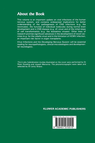 1. The viral infections of the developing nervous system: an overview.- 2. Reovirus infections of the central nervous system.- 3. Dysmyelination in transgenic mice containing the early region of JC virus.- 4. Bovine leukaemia: facts and hypotheses derived from the study of an infectious cancer.- 5. Human immunodeficiency virus brain infection in infants and children.- 6. Persistent infection of mice with lymphocytic choriomeningitis virus.- 7. Differentiation-linked susceptibility of nervous and muscular tissue of mice to infection with Moloney murine leukaemia virus.- 8. Antigenic phenotype and experimental herpes simplex virus infection of cultured human fetal neural cells.- 9. Human cytomegalovirus: the major envelope glycoprotein as a candidate for a subunit vaccine.- 10. Rubella virus and its effects on the developing nervous system.- 11. Experimental mumps virus infections in the developing nervous system.- 12. Neurotransmitter-related activities of MHV3-infected cortical cells in culture.