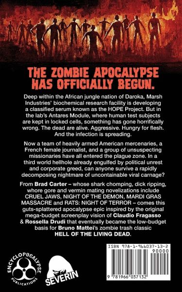 Deep within the African jungle nation of Daroka, Marsh Industries' biochemical research facility is developing a classified serum known as the HOPE Project. But in the lab's Antares Module, where human test subjects are kept in locked cells, something has gone horrifically wrong. The dead are alive. Aggressive. Hungry for flesh. And the infection is spreading. Now a team of heavily armed American mercenaries, a French female journalist, and a group of unsuspecting missionaries have all entered the plague zone. In a third world hellhole already engulfed by political unrest and corporate greed, can anyone survive a rapidly decomposing nightmare of uncontainable viral carnage? From Brad Carter - whose shark chomping, dick ripping, whore gore and vermin mating novelizations include CRUEL JAWS, NIGHT OF THE DEMON, MARDI GRAS MASSACRE and RATS: NIGHT OF TERROR - comes this guts-splattered apocalypse epic inspired by the original mega-budget screenplay vision of Claudio Fragasso & Rossella Drudi that eventually became the low-budget basis for Bruno Mattei's zombie trash classic HELL OF THE LIVING DEAD.