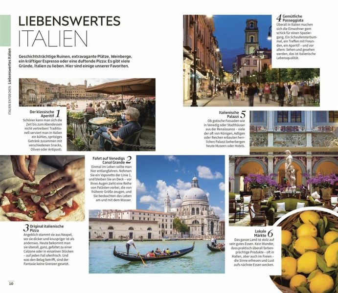 - Italien wartet auf Sie: Lassen Sie sich mit dem praktischen und informativen Italien-Reiseführer zu den schönsten Erlebnissen, Attraktionen und Sehenswürdigkeiten Italiens führen - ob mit der Gondel durch Venedig fahren, mittelalterliche Burgen inmitten von Weinbergen und Olivenhainen in der Toskana entdecken, im Parco Nazionale d´Abruzzo nach Braunbären Ausschau halten oder die besondere Stimmung bei Sonnenaufgang am Petersplatz in Rom genießen.