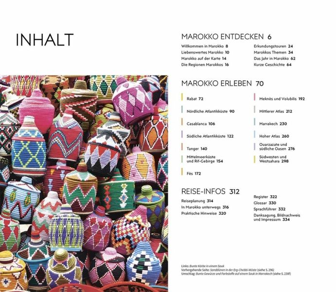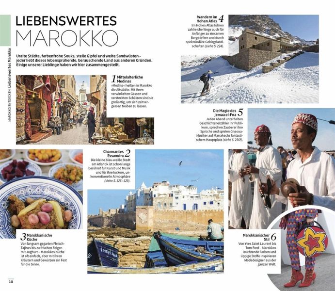 In quirlige Souks voller bunter Waren eintauchen, in spektakulärer Gebirgslandschaft zu einsamen Bergdörfern wandern, eine Nacht unterm Sternenhimmel in der Wüste verbringen oder frische Meeresfrüchte am Strand genießen: Lassen Sie sich vom Vis-à-Vis Reiseführer Marokko zu den wichtigsten Sehenswürdigkeiten und beeindruckendsten Orten des Landes führen. Mit fundiertem Expertenwissen, inspirierenden Fotos und detaillierten Karten stellt Ihnen der übersichtliche Reiseführer die schönsten Regionen und Städte mit allen Attraktionen vor - von den Königsstädten Fès, Marrakech, Meknès und Rabat, die sich mit prächtigen Moscheen, Palästen und historischen Medinas schmücken, über Küstenstädte wie das unkonventionelle Tanger und das entspannte Essaouira bis hin zu den endlosen Wüsten und einsamen Oasen im Süden. Ob 10 Tage in den Tälern und Kasbahs im Süden oder eine längere Rundreise durch Marokko - hier finden Sie passende Reiserouten und Empfehlungen für Aktivitäten, Restaurants und Hotels, um das Beste aus Ihrem Marokko-Urlaub herauszuholen!