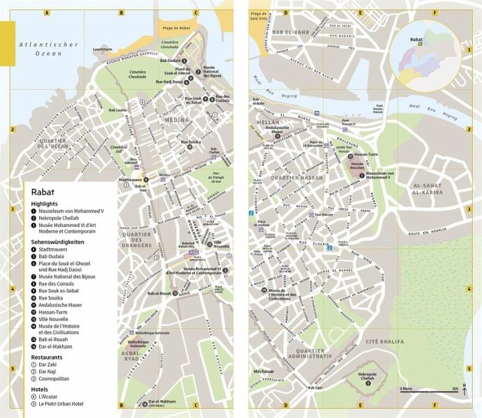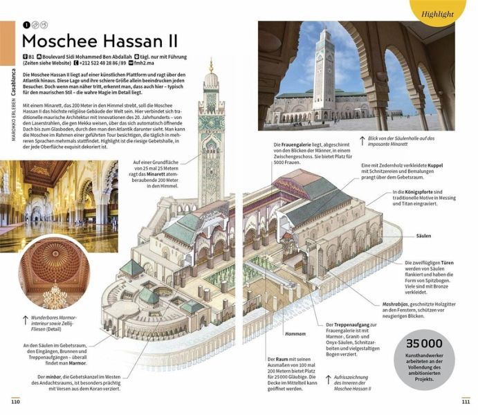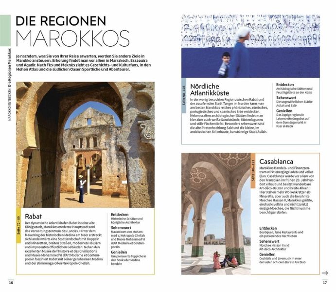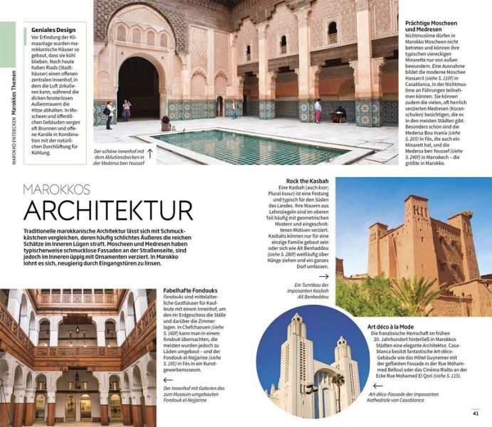 Die einzigartigen 3-D-Illustrationen der Vis-à-Vis Bände bieten Ihnen ganz neue Einblicke in berühmte Gebäude und Sehenswürdigkeiten, darunter Wahrzeichen wie das Mausoleum von Mohammed V in Rabat, die Medersa Bou Inania in Fès und die Moschee Hassan II in Casablanca. Mit den handgezeichneten Spaziergängen entdecken Sie die schönsten Orte verschiedener Stadtteile auf ganz besondere Art und Weise. Bildgewaltige Themenseiten rücken charakteristische Besonderheiten - wie die traditionelle marokkanische Architektur, die faszinierende Tierwelt oder die großartige marokkanische Küche - in den Fokus.