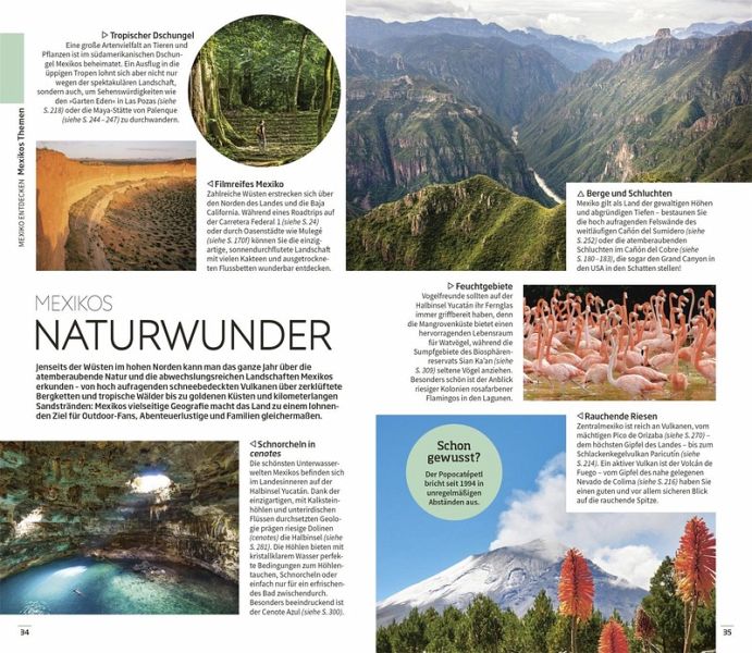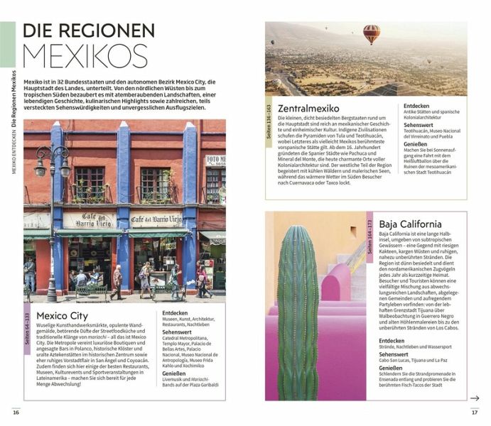 - Die schönsten Städte und Regionen: Die fabelhaftesten Gegenden stellen sich Ihnen im Reiseführer Mexico Region für Region in ihrer gesamten Pracht vor - mit fundierten und qualitativen Inhalten sowie unvergesslichen Highlights aus Kultur und Alltag. Dazu gehören die spektakulären Berge und Vulkane im Landesinneren ebenso wie der Dschungel im Süden mit seiner vielfältigen Tierwelt und mesoamerikanischen Ruinen sowie die Kakteenwüsten in Mexicos Norden. Die Küstenregionen reichen von zerklüfteten Gebirgslandschaften über ursprüngliche Uferabschnitte und authentische kleine Ortschaften bis zu den karibischen Traumstränden der Riviera Maya. Mexico City gilt mit seinen belebten Straßen, bunten Galerien und der lebendigen Kulturszene als eine der aufregendsten Städte der Welt. Von Baja California bis zur Halbinsel Yucatán können Sie mit diesem Reiseführer Ihren perfekten Urlaub zusammenstellen.
