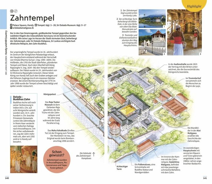 - Handgezeichnete 3-D-Aufrisszeichnungen: Sensationelle 3-D-Aufrisszeichnungen zeigen jedes Detail verschiedener Stadtteile und Bauwerke aus der Vogelperspektive und bieten ganz neue und einmalige Einblicke in die Sehenswürdigkeiten - beispielsweise in den heiligen Zahntempel in Kandy, mit einer der wichtigsten Reliquien der Buddhisten.