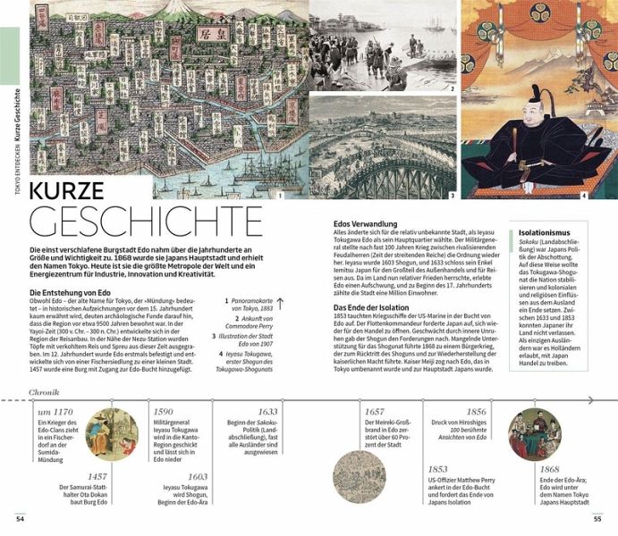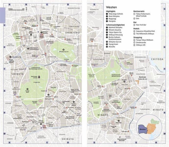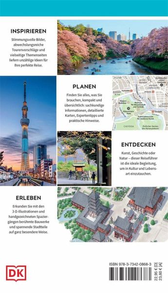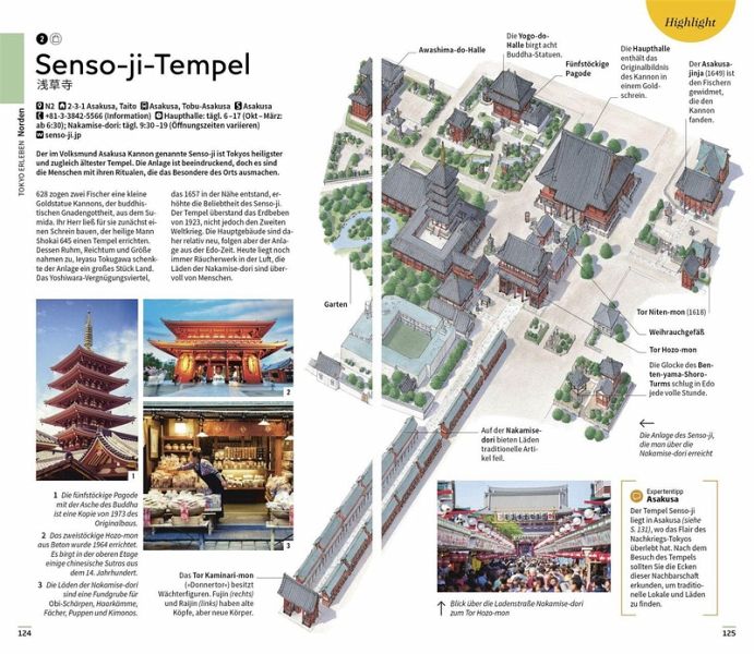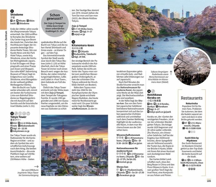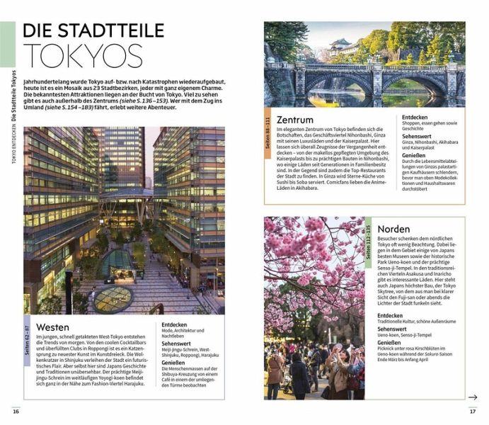 der ji-Tempel, der älteste und zugleich heiligste Tempel Tokyos, und der ehrwürdige Gu Schrein. Mit den handgezeichneten Spaziergängen entdecken Sie die schönsten Orte verschiedener Stadtteile auf ganz besondere Art und Weise. Bildgewaltige Themenseiten rücken charakteristische Besonderheiten - wie die alten Traditionen aus der Edo-Ära, Tokyos vielfältige Essenskultur oder die wunderschönen Gärten und Parkanlagen - in den Fokus.