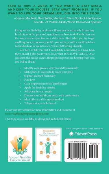 Living with a disability or chronic illness can be extremely frustrating. In addition to the pain and symptoms you have to deal with there are the many barriers you face on a daily basis. Then when you try to get anything done to improve your life, you are faced with a world that does not understand or seem to care. You are left feeling invisible. I am here to tell you that I completely understand as I have been there myself. I also want you to know that YOU HAVE VALUE. Once you learn the insider secrets the people in power are keeping from you, you will be able to . Identify your greatest desires and dreams in life . Make plans to successfully reach your goals . Support yourself financially . Find love . Gain employment or self-employment . Apply for disability benefits . Advocate for your needs . Discuss your healthcare needs with professionals . Meet others and form relationships . Tell your story and be heard Please visit my website for more information and resources at www.visableandempoweredbook.com This book is also available in ebook and audiobook format...