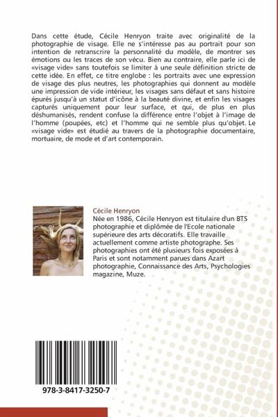 Dans cette étude, Cécile Henryon traite avec originalité de la photographie de visage. Elle ne s'intéresse pas au portrait pour son intention de retranscrire la personnalité du modèle, de montrer ses émotions ou les traces de son vécu. Bien au contraire, elle parle ici de «visage vide» sans toutefois se limiter à une seule définition stricte de cette idée. En effet, ce titre englobe : les portraits avec une expression de visage des plus neutres, les photographies qui donnent au modèle une impression de vide intérieur, les visages sans défaut et sans histoire épurés jusqu'à un statut d'icône à la beauté divine, et enfin les visages capturés uniquement pour leur surface, et qui, de plus en plus déshumanisés, rendent confuse la différence entre l'objet à l'image de l'homme (poupées, etc) et l'homme qui ne semble plus qu'objet. Le «visage vide» est étudié au travers de la photographie documentaire, mortuaire, de mode et d'art contemporain.