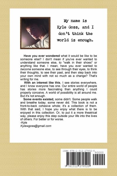 This is a collection of short stories by an aspiring author, ranging in genre from adventure, satire, thriller, and essay pieces, along with much more. With a strong character and world-building focus, realistic dialogue, and potent originality, this is an all-encompassing sample of the writing ability I possess. Writing is a passion I would like to make my life, and I hope this is my first step to do that. If you'd spare a glance, that would mean the world to me.
