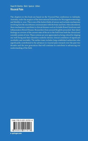 The chapters in this book are based on the Visceral Pain conference in Adelaide, Australia, under the auspices of the International Federation for Neurogastroenterology and Motility in 2021. This is one of the hottest fields of science and includes mechanisms involving how the microbiome communicates with the brain and how, when disordered, these mechanisms contribute to clinical diseases such as Irritable Bowel Syndrome and Inflammatory Bowel Disease. Researchers from around the globe presented their latest findings as a review of the current state of the art in the field from both the clinical and scientific points of view. These systems are now appreciated as being critical for shaping our well-being and their disorders underlie chronic clinical conditions of significant morbidity and mortality. The author team includes long-established authorities who significantly contributed to the advances in visceral pain research over the past two decades and the new generation thatwill continue to contribute to advancing our understanding of the field.
