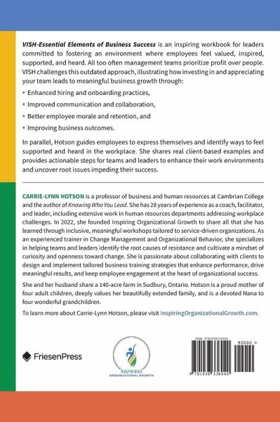 VISH-Essential Elements of Business Success is an inspiring workbook for leaders committed to fostering an environment where employees feel valued, inspired, supported, and heard. All too often management teams prioritize profit over people. VISH challenges this outdated approach, illustrating how investing in and appreciating your team leads to meaningful business growth through: ¿ Enhanced hiring and onboarding practices, ¿ Improved communication and collaboration, ¿ Better employee morale and retention, and ¿ Improving business outcomes. In parallel, Hotson guides employees to express themselves and identify ways to feel supported and heard in the workplace. She shares real client-based examples and provides actionable steps for teams and leaders to enhance their work environments and uncover root issues impeding their success.