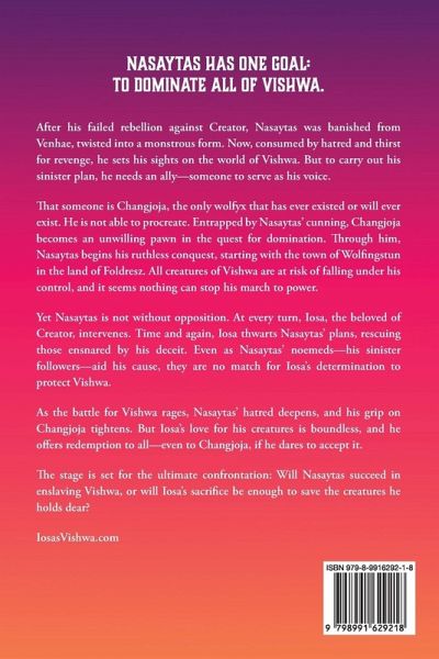 Nasaytas has one goal: to dominate all of Vishwa. After his failed rebellion against Creator, Nasaytas was banished from Venhae, twisted into a monstrous form. Now, consumed by hatred and thirst for revenge, he sets his sights on the world of Vishwa. But to carry out his sinister plan, he needs an ally-someone to serve as his voice. That someone is Changjoja, the only wolfyx that has ever existed or will ever exist. He is not able to procreate. Entrapped by Nasaytas' cunning, Changjoja becomes an unwilling pawn in the quest for domination. Through him, Nasaytas begins his ruthless conquest, starting with the town of Wolfingstun in the land of Foldresz. All creatures of Vishwa are at risk of falling under his control, and it seems nothing can stop his march to power. Yet Nasaytas is not without opposition. At every turn, Iosa, the beloved of Creator, intervenes. Time and again, Iosa thwarts Nasaytas' plans, rescuing those ensnared by his deceit. Even as Nasaytas' noemeds-his sinister followers-aid his cause, they are no match for Iosa's determination to protect Vishwa. As the battle for Vishwa rages, Nasaytas' hatred deepens, and his grip on Changjoja tightens. But Iosa's love for his creatures is boundless, and he offers redemption to all-even to Changjoja, if he dares to accept it. The stage is set for the ultimate confrontation: Will Nasaytas succeed in enslaving Vishwa, or will Iosa's sacrifice be enough to save the creatures he holds dear? IosasVishwa.com