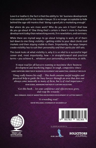 This book has visibility as its central theme. It will help you to establish where you need to be visible, how to achieve and maintain visibility with clients, and how to convert visibility into new work.It shares a variety of tried-and-tested approaches to boosting visibility, so you can choose those that suit you best. Every suggestion is designed to be put into practice around fee earning responsibilities. Features of this book: Chapters on how to create visibility and stay visible to clients as well as referrers, how to effectively network to get the best results, and intelligent marketing advice that will aid you and your firm in being more visible. Practical tips to manage your day-to-day marketing activities that can be implemented easily and without a huge requirement for time or budget. Highly practical advice you can put into immediate action, including a series of mini-masterclasses with step-by-step guidance and various templates that can be adapted for your own use.