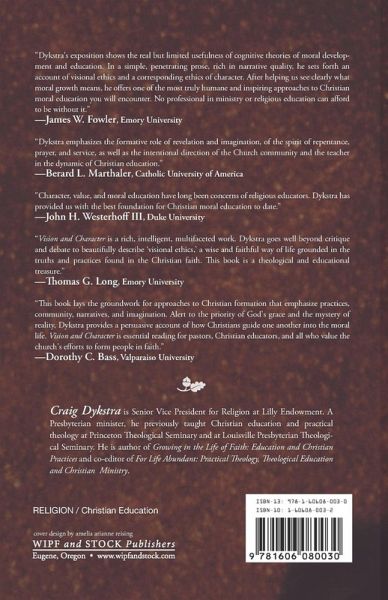 ""Craig Dykstra has done it: he has written a readable, engaging book which does justice to the complex texture of moral existence as we experience it. His exposition shows the real but limited usefulness of cognitive theories of moral development and education. In a simple, penetrating prose, rich in narrative quality, he sets forth an account of visional ethics and a corresponding ethics of character. After helping us see clearly what moral growth means, he offers one of the most truly humane and inspiring approaches to Christian moral education you will encounter. This is a superb book for any thoughtful reader. No professional in ministry or religious education can afford to be without it."" --James W. Fowler, Emory University ""For Christian educators this book is going to mark the end of the Lawrence Kohlberg era in moral education and open up a fresh understanding of how repentance, prayer, and service nourishes moral development."" --C. Ellis Nelson, Louisville Presbyterian Theological Seminary ""Dykstra emphasizes the formative role of revelation and imagination, of the spirit of repentance, prayer, and service, as well as the intentional direction of the Church community and the teacher in the dynamic of Christian education. Drawing on insights from literature, psychology, and experience, his work is at once informative and inspirational."" --Berard L. Marthaler, Catholic University of America ""Vision and Character is a book for which I have been waiting and longing. Character, value, and moral education have long been concerns of religious educators. Today's literature is dominated by developmentalism and the work of Kohlberg. . . . Here, at last, in this thoughtful, readable, useful book is a true alternative. Dykstra has provided us with the best foundation for Christian moral education to date."" --John H. Westerhoff III, Duke University ""Dykstra is one of today's new group of brilliant young Christian education thinkers, and this is his first book. Dykstra is a person to hear carefully both now and in the future."" --D. Campbell Wyckoff, Princeton Theological Seminary Craig Dykstra is Vice President for Religion for the Lilly Endowment, Inc. He previously taught Christian education at Louisville Presbyterian Theological Seminary (1977-84) and served as Thomas W. Synnott Professor of Christian Education at Princeton Theological Seminary (1984-89), where he was also editor of the journal Theology Today. An ordained minister in the Presbyterian Church (USA), Dykstra is a graduate of the University of Michigan (BA) and Princeton Seminary (MDiv, PhD). Dykstra is also the author of Growing in the Life of Faith: Education and Christian Practices (1999, 2005), and has published over 100 monographs, chapters of books, articles, editorials, and other commentaries.