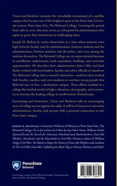 Vision and Resilience recounts the remarkable turnaround of a satellite campus that became one of the brightest spots in the Penn State University system: Penn State Erie, The Behrend College. Covering the period from 1980 to 2010, this story serves as a blueprint for administrators who aspire to grow their institutions in challenging times. Joseph M. Beilein Jr. writes about how, at a time when tensions were high between faculty and the administration, students and the administration, students and the police, and even among the students themselves, The Behrend College saw an unprecedented increase in enrollment, endowments, land acquisition, building, and curricular opportunities. He describes how administrators John Lilley and Jack Burke worked with local leaders, faculty, and other officials to transform The Behrend College into a research institution-and how they worked with faculty, coaches, and even students to convince young people that Behrend was, in fact, a destination campus. All of these efforts resulted in a college that bucked trends in higher education, demography, and economics to become the leading college in northwestern Pennsylvania. Fascinating and instructive, Vision and Resilience tells an encouraging story of college success against the odds. It will be of interest to university administrators, faculty, and anyone with a personal connection to the Penn State campus farthest from University Park.