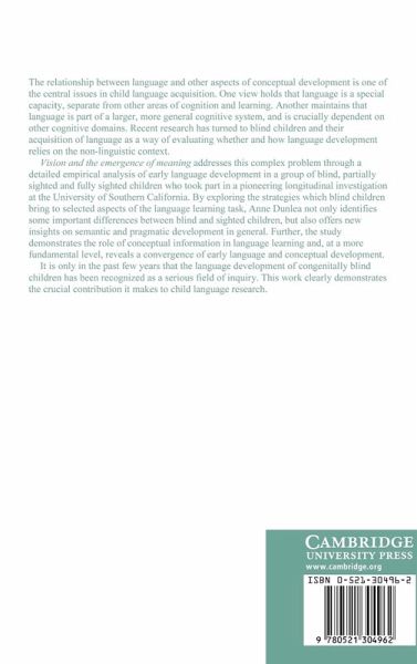 The relationship between language and other aspects of conceptual development is one of the central issues in child language acquisition. One view holds that language is a special capacity, separate from other areas of cognition and learning. Another maintains that language is part of a larger, more general cognitive system, and is crucially dependent on other cognitive domains. Recent research has turned to blind children and their acquisition of language as a way of evaluating whether and how language development relies on the non-linguistic context. Vision and the Emergence of Meaning addresses this complex problem through a detailed empirical analysis of early language development in a group of blind, partially sighted and fully sighted children who took part in a pioneering longitudinal investigation at the University of Southern California. By exploring the strategies which blind children bring to selected aspects of the language learning task, Anne Dunlea not only identifies some important differences between blind and sighted children, but also offers new insights on semantic and pragmatic development in general. Further, the study demonstrates the role of conceptual information in language learning and, at a more fundamental level, reveals a convergence of early language and conceptual development.