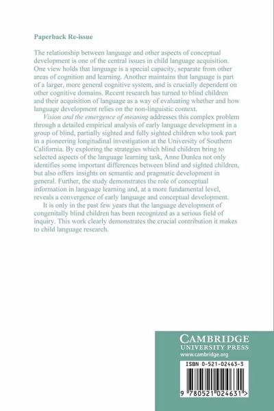 The relationship between language and other aspects of conceptual development is one of the central issues in child language acquisition. One view holds that language is a special capacity, separate from other areas of cognition and learning. Another maintains that language is part of a larger, more general cognitive system, and is crucially dependent on other cognitive domains. Recent research has turned to blind children and their acquisition of language as a way of evaluating whether and how language development relies on the non-linguistic context. Vision and the Emergence of Meaning addresses this complex problem through a detailed empirical analysis of early language development in a group of blind, partially sighted and fully sighted children who took part in a pioneering longitudinal investigation at the University of Southern California. By exploring the strategies which blind children bring to selected aspects of the language learning task, Anne Dunlea not only identifies some important differences between blind and sighted children, but also offers new insights on semantic and pragmatic development in general. Further, the study demonstrates the role of conceptual information in language learning and, at a more fundamental level, reveals a convergence of early language and conceptual development.